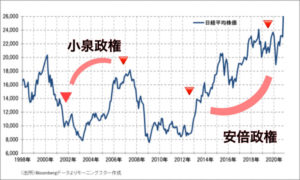 株価とマネタリーベースには関連性があります。株価の上昇した安倍内閣でしたが、結果的にはデフレの脱却ができませんでした。何故でしょうか?せっかくインフレの兆しを見せた景気動向に消費税の10%増税とコロナウィルスが景気に冷や水を浴びせたからだと思います。