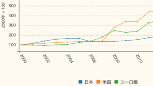 このとき、アメリカやEUの中央銀行はデフレ不況を回避する為に、大きくマネタリーベースを拡大させました。当時の日本銀行は金融緩和政策をおこないませんでした。